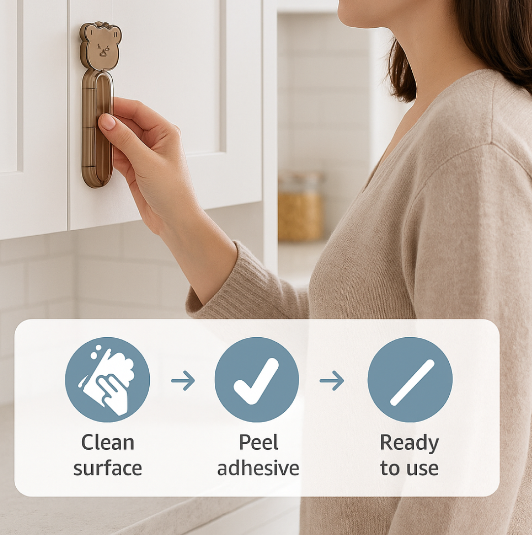 • No Drill Installation: Tool free mounting protects cabinets, uPVC and aluminium frames, glass, tiles, and painted wood.